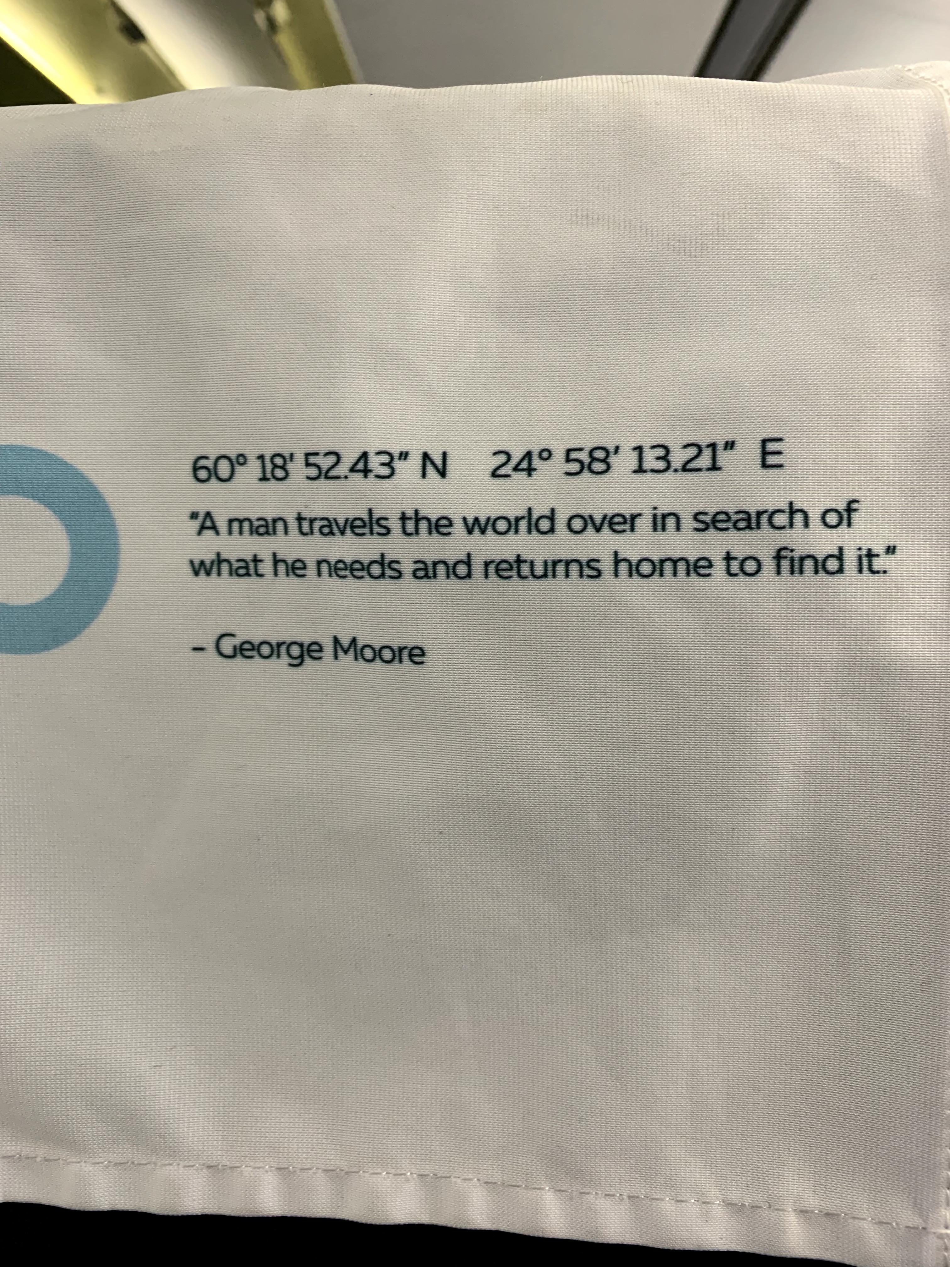1. Keep the posts coming, Leslie. I love the Moore quote. It’s been said numerous times the world over but to find it printed on the back of your Finnair seat cover along with the precise geographic coordinates of your location is so rich! Bravo to the Finns and to you!
